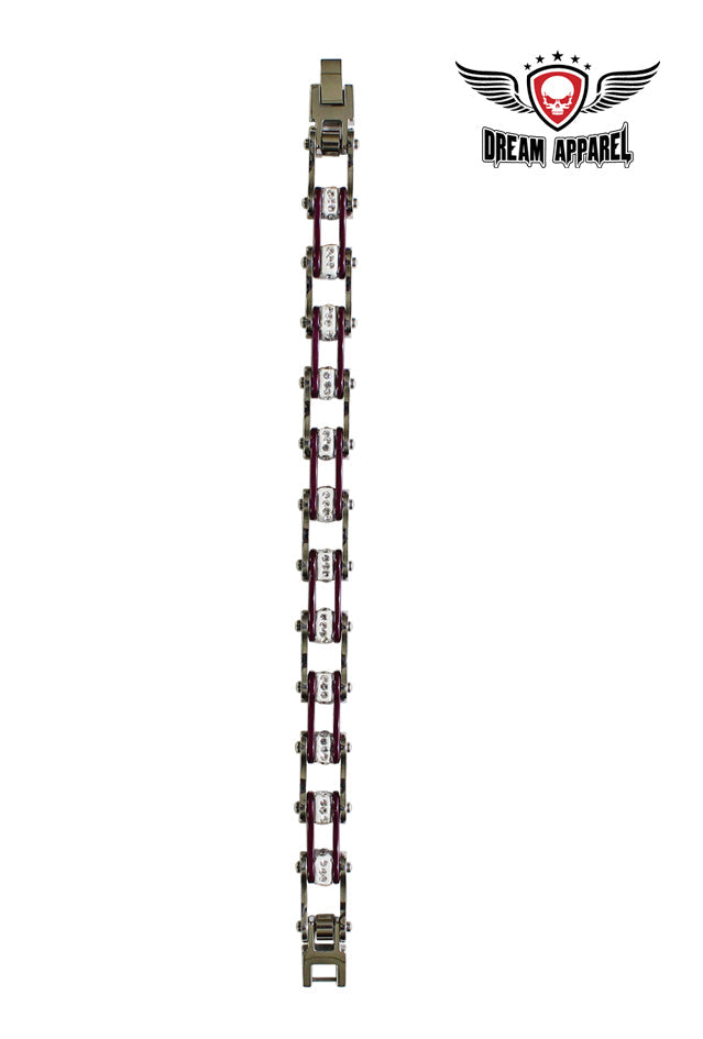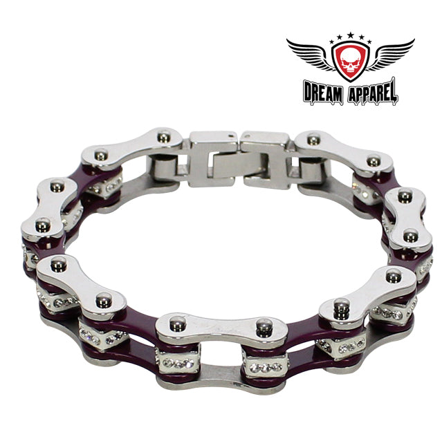 Beautiful large white squares placed inside this chrome and purple motorcycle bracelet which features clear gemstones implanted on it. Each stone is perfectly placed, and stands out in a great fashion. The bracelet has a heavy duty chrtome clasp makingsure the fit is comfy and very much adjustable. This glamourous bracelet is truly a must have and we hope you take this oppurtunity to grab yours now!
