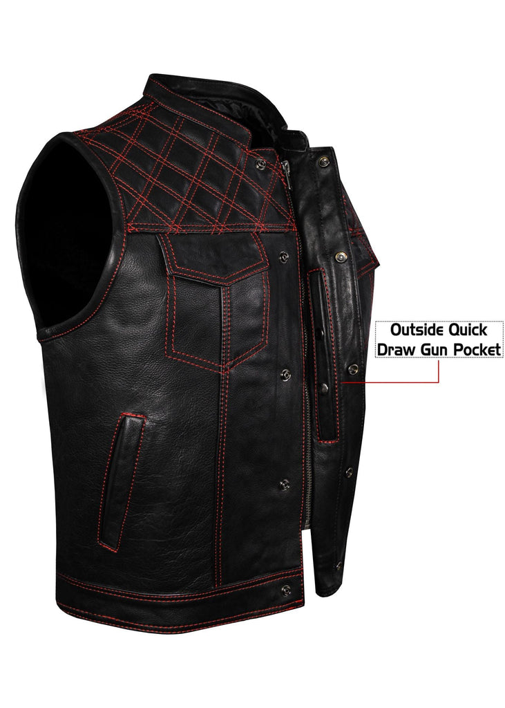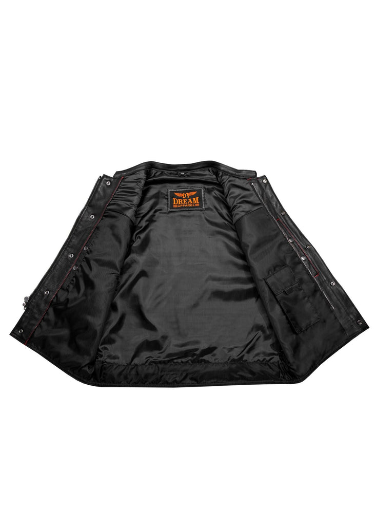 You don't just ride with any crew, and you don't support any club, so don't just wear any ordinary vest folks. Dream Apparel Mens Black Premium Leather Motorcycle Club Vest, Red Thread and with Diamond Padding is essential for any biker who wants to show off their attitude, this vest is made of high quality cowhide leather and features a solid back panel to show off numerous patches or club colors. With multiple front pockets to store items and zippered front closure with button snaps you'll have no problem throwing this vest on for the next important meeting. Also equipped with polyester liner, 2 inside zipper pockets, 2 slip pockets and 2 large gun pockets with zipper, snap closure, you can gear up right with confidence for any ride.