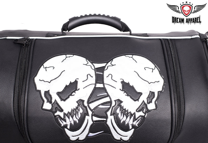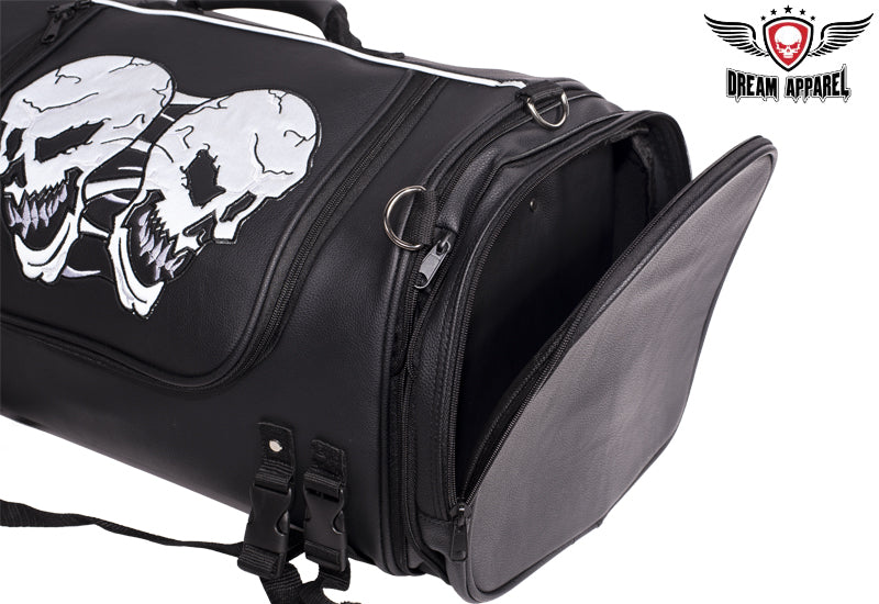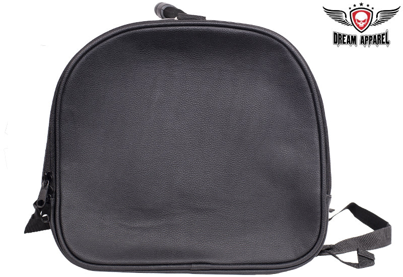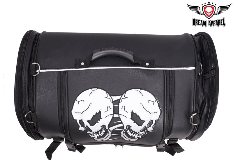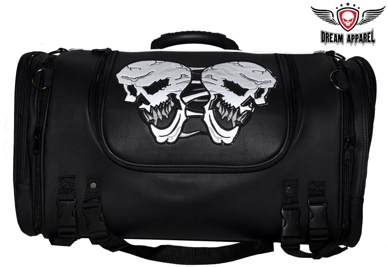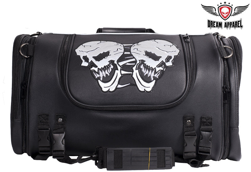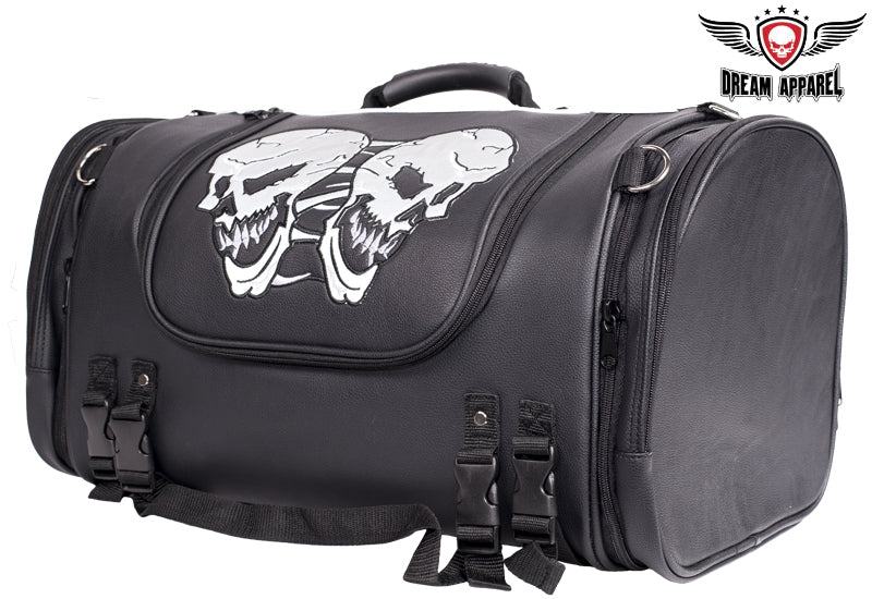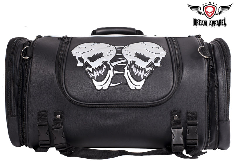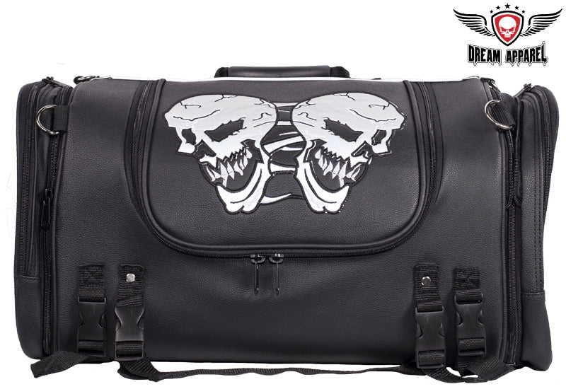 Dream Apparel has every biker covered, our medium sized sissy bar bag with reflective skulls is the perfect accessory for the weekend warrior motorcycle rider. Designed for the biker who doesn't want a bulky sissy bar bag, its heavy duty PVC handle, medium size, 2 heavy duty nylon Velcro straps makes this bag easy to attach or detach from most motorcycle sissy bars and perfect to use as luggage bag at desired location. This long lasting PVC bag has 2 expandable side pockets with zipper closure, and large front zipper closure to access your belongings. Internal steel frame and plastic lining gives this bag a rigid shape and will safely store clothes, boots, tools, electronics, phone etc... Multiple steel D rings and 2 extra nylon straps with quick release buckles insures you can secure extra gear to bag, that's not all folks, we also designed bag with quick release buckles to be compatible with any of our large sissy bar bags for future storage on the next big ride.