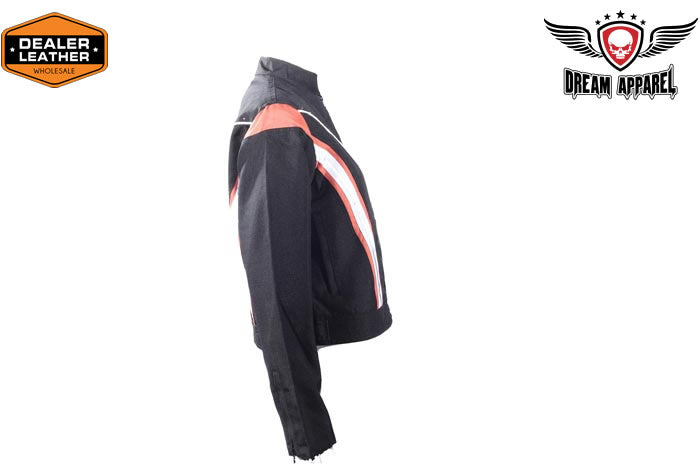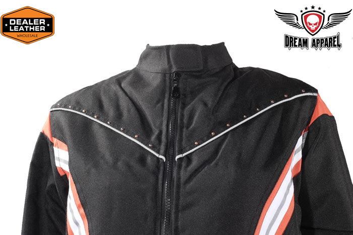 Ladies, you're able to really standout with our beautiful new black textile jacket featuring an orange and whitestripes as well as studs. The studs can be found going along the chest area. This jacket is really an eye catcher as it has a very unique exterior build and is both stylish as well as comfortable. The lightweight aspect of the jacket improves maneuverability as well as avoiding the bulky feel. Regular and zipout lining is found within the jacket. Standard pockets are on the waist of the jacket along with a hidden pocket on the inside. Lastly, the racer style collar really gives this piece the final touch needed to perfect it. Overall this jacket is a must have, especially for the ladies who like to be the talk of the room. So don't miss out, get yours today.
