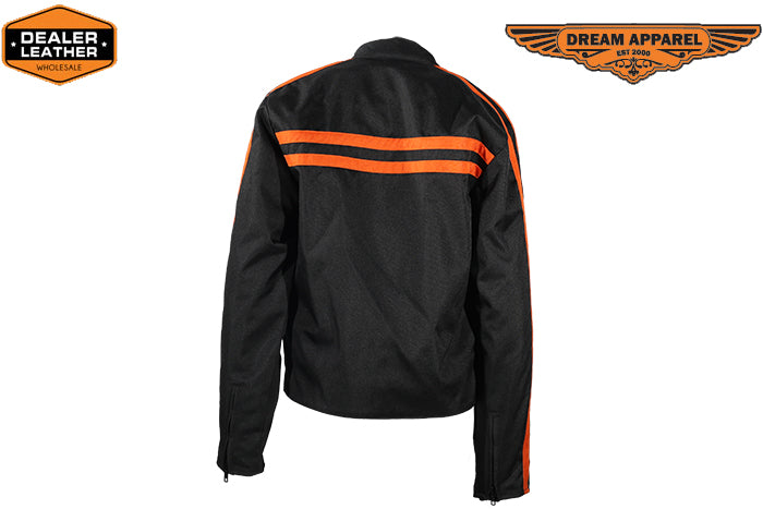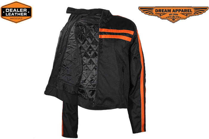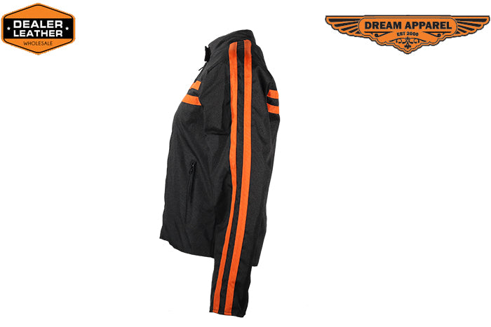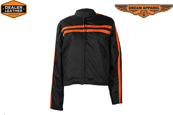 Ladies, this ones for you. Dream Apparel brings to you our beautiful black textile jacket with orange stripes across the chest and down the arms. The lightweight aspect makes this jacket very comfortable as well as great on the go. The increased maneuverability is definitely a plus. Along with that, this jacket is a very stylish option for the ladies.