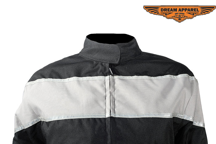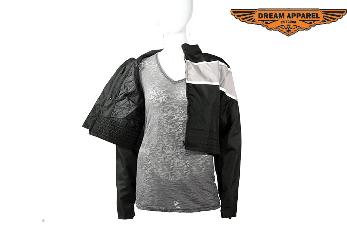 Ladies, this ones for you. Dream Apparel brings to you our beautiful black textile jacket with a thick white stripe across the chest and back. The lightweight aspect makes this jacket very comfortable as well as great on the go. The increased maneuverability is definitely a plus. Along with that, this jacket is a very stylish option for the ladies. Inside the jacket, regular and zipout lining can be found. Lastly, the racer style collar really gives this jacket a more eye caching look. This jacket is a must have for all, so do yourself a favor and be the talk of the room.