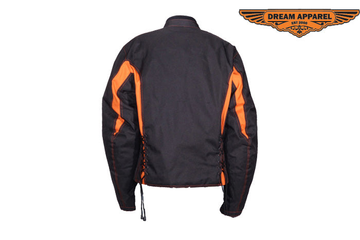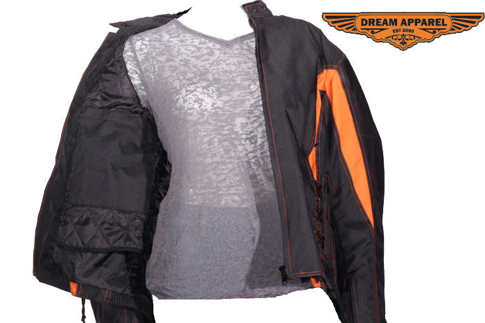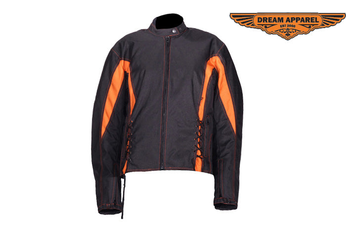 This beautiful ladies black and orange textile racer jacket is a perfect option for those looking to improve upon your style while remaining comfortable. This jacket removed all the armor and padding which allows you to be extremely lightweight, great for those on the move. Multiple pockets can be found on this beauty, all of which is a big help in every way. The two sets of laces on the front and back assure the most adjustable fit possible. Grab yours now!