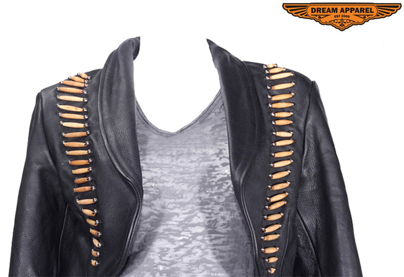 This beautiful womens bolero jacket with bones and beads work on front and few on sleeves features nylon lining. The balero does not have snaps or zipper. Great purchase, grab yours now!
