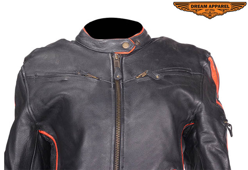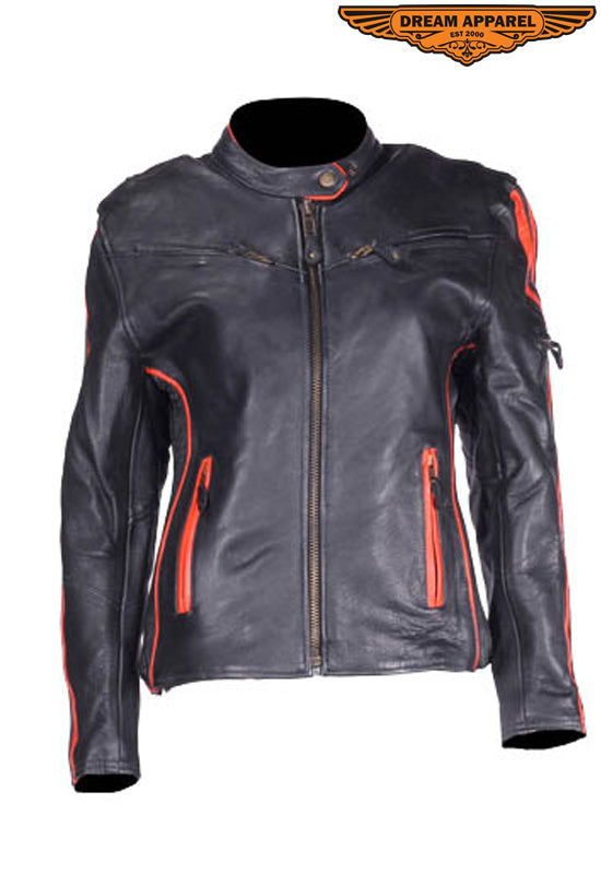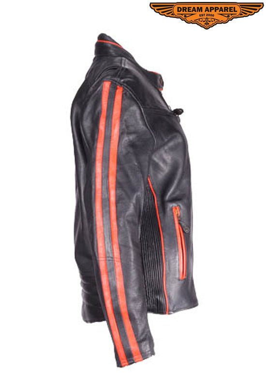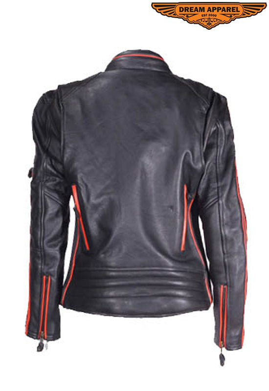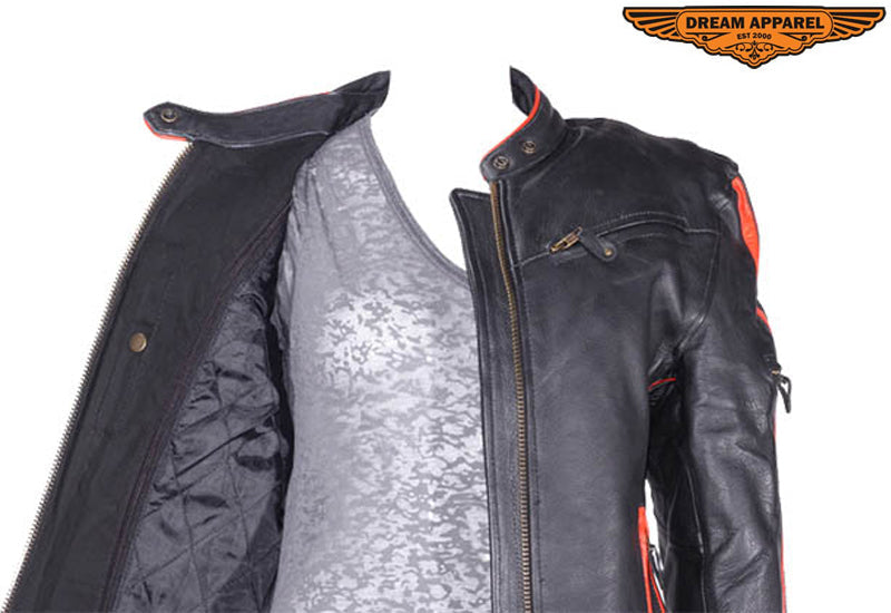 Ladies leather racer jacket is made out of a heavy duty yet soft to the touch top grade leather and a Z/O lining that runs through the sleeves. Jacket also features 2 leather air vents on the front and back, vertically gathered sides, multiple pockets inside and out, and zippered cuffs for a comfortable fit.