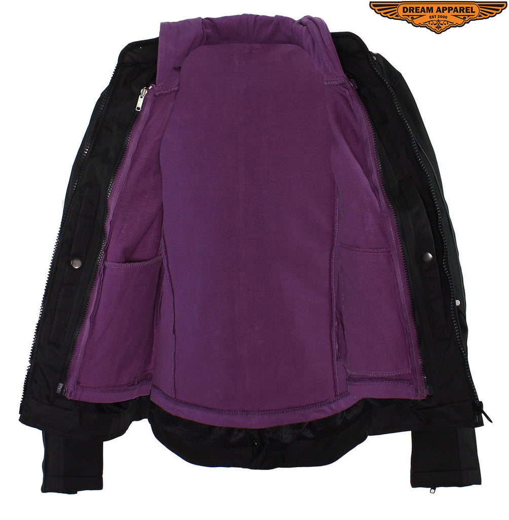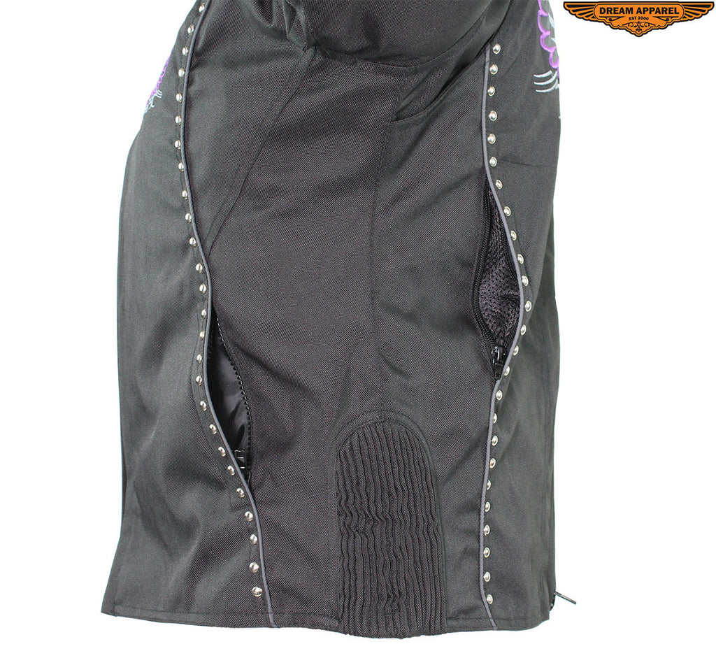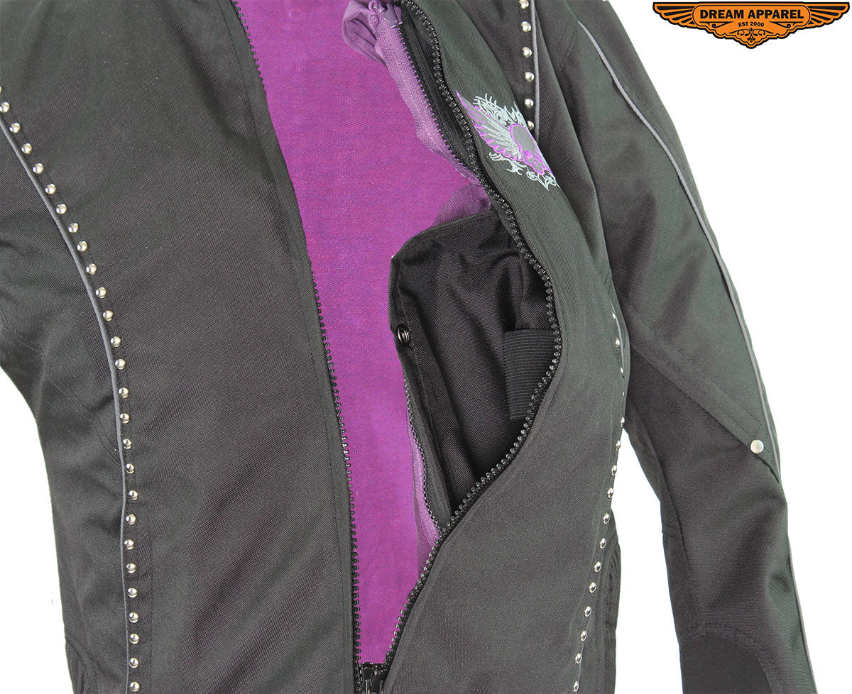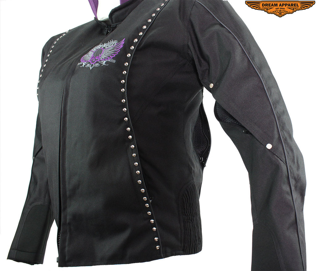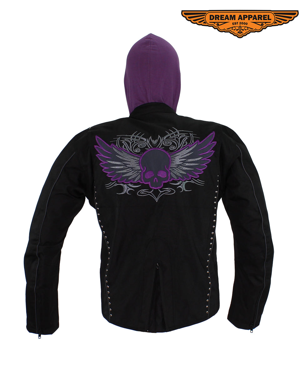 Women's Studed Motorcycle Textile Jacket With Purple Hoodie & Sull & Wings