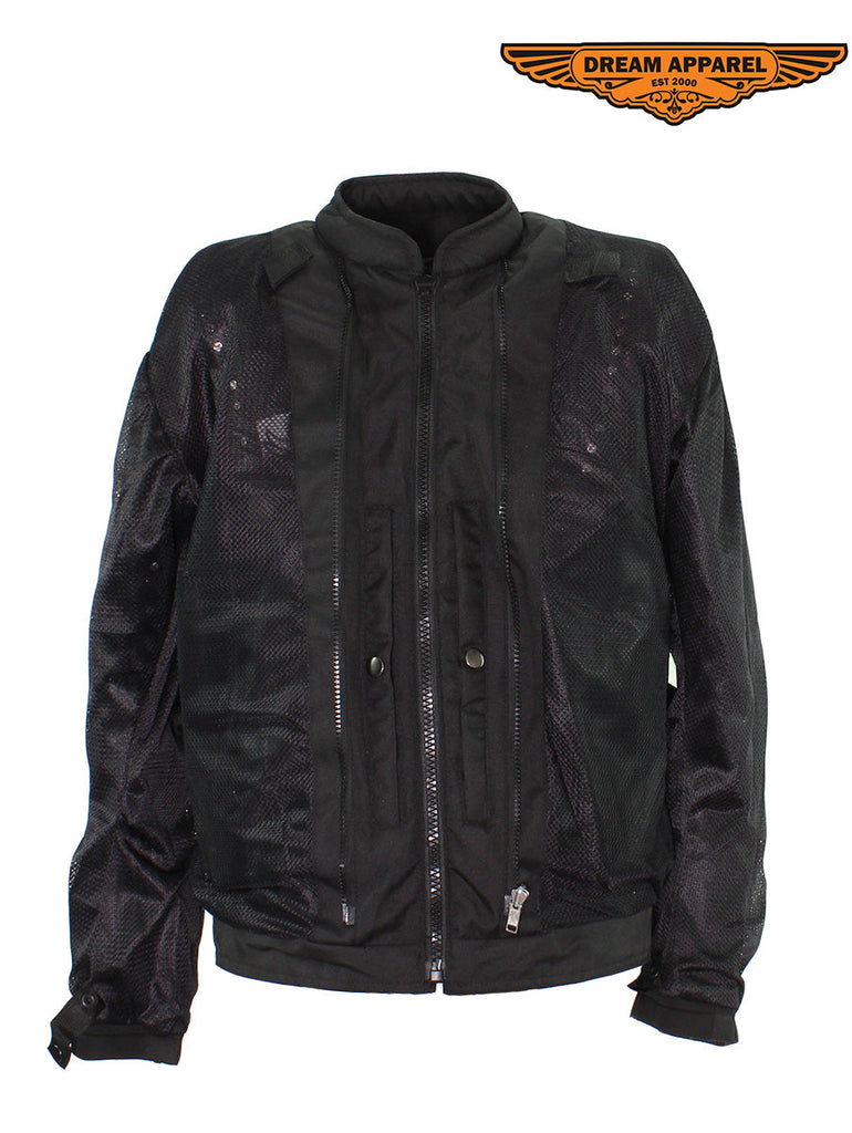 Ride comfortably wearing our improved strong and durable black and pink textile racer jacket featuring a fresh skull design with wings and reflective details. You will absolutely love the array of features that include a complete zip-out hoodie lining that runs through the sleeves, a padded racing style collar, elastic gathering on the sides, two zippered vents on back, two zippered vents under the arms, and zippered cuffs. Keep all our belongings secure with two large gun pockets with snap button closures, two interior slip pockets with Velcro closures, and two roomy zippered pockets on the waist. Once you Try this comfortable stylish jacked you will wonder how you ever rode without it.