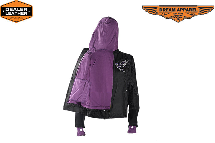 Foxy ladies ride tough and need a jacket that suites their sassy attitude, Dream Apparel works hard at designing gear that is functional and stylish for the biker babes who want protection and charm on the next cruise. Our women Textile Mesh Nylon Jacket is made out of durable long lasting nylon material, with reflective piping, purple stitching and multiple embroidered purple n white butterflies you ladies will look great at any occasion. Zipper on back hem, elastic sides and elastic panel with zipper cuffs insure function and multiple pockets for storage make this jacket superior. Multiple air vents with zipper closures and a purple full sleeve zip out liner make for all season riding. More than a zip out liner, this purple liner is a sweatshirt/hoodie with front pockets and thumb holes at cuffs for use with or without jacket. This women Textile jacket will please any lady on her next motorcycling mission.