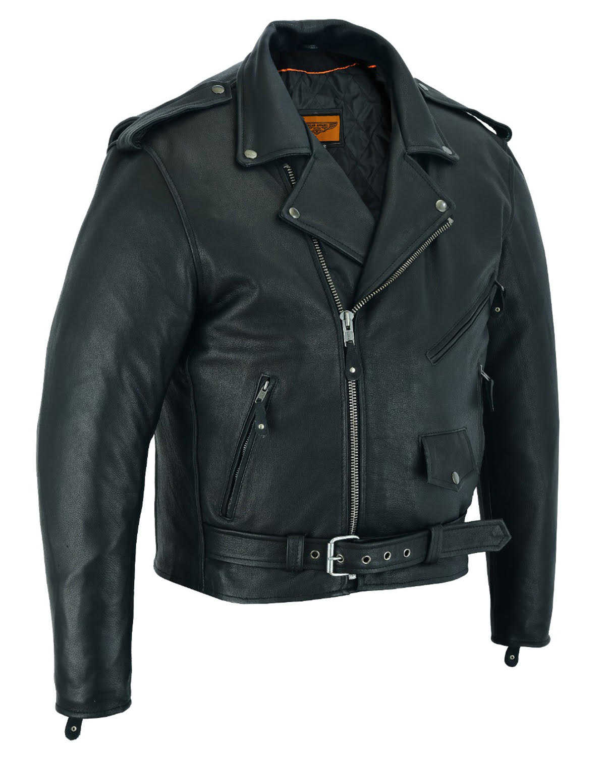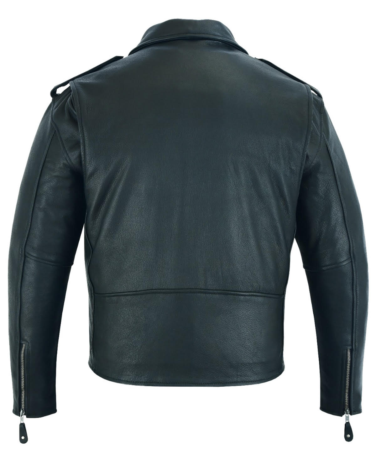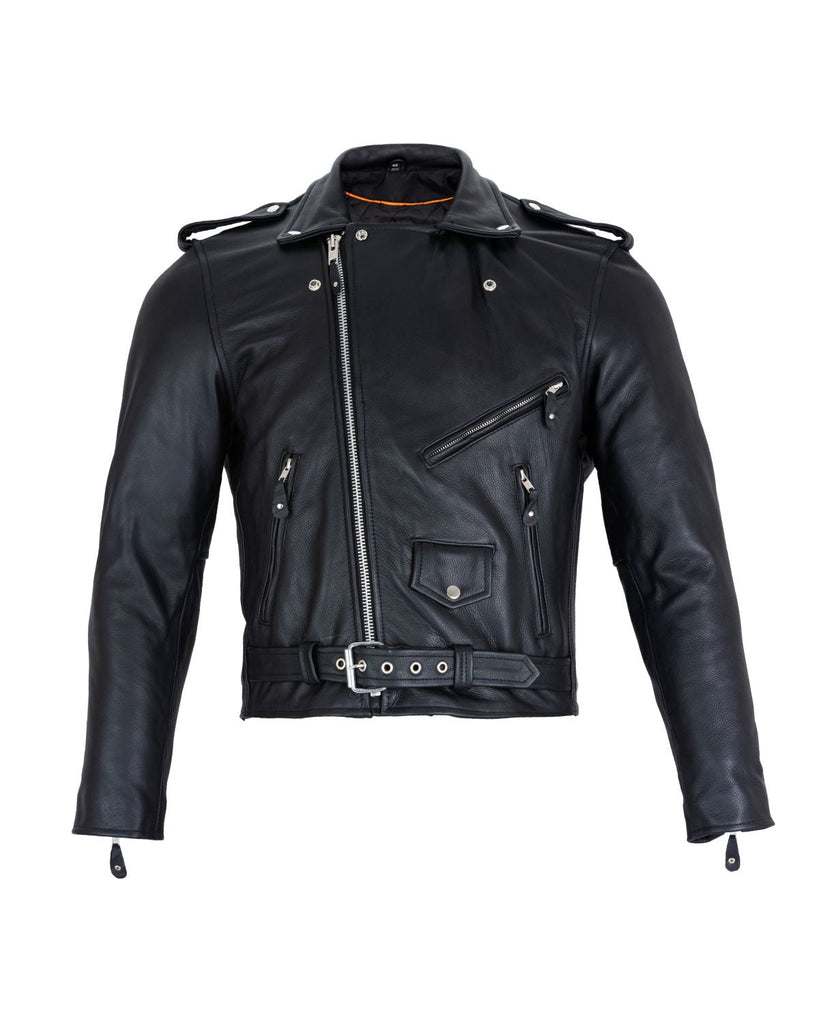Woah. This gorgeous police style classic biker jacket in cowhide leather is a must have for piece for any and every biker alike. Our jacket features a full, zip-out lining that runs through the sleeves, epaulets on the shoulders, a full panel on the back to add your clubs' colors, a fold-down collar with button snaps, side laces, and a sturdy, front zip-up closure. You'll feel great as you tighten up the leather belt and zippered cuffs. It won't matter if you're going out for the day or just around the corner, you'll never have to leave it behind with two waist pockets, two concealed gun pockets, a stash pocket, and a zippered pocket on the left front. Ride proudly in comfort and style with this amazing jacket, and don't miss out.