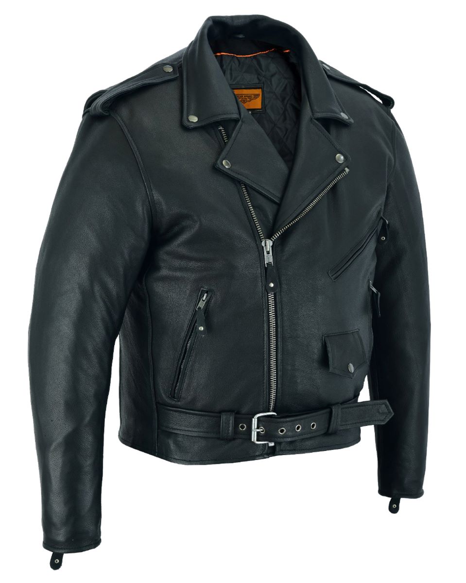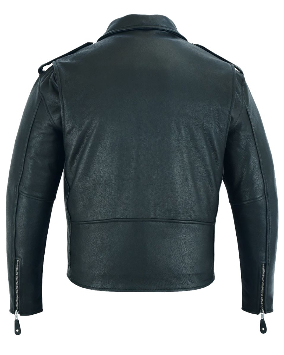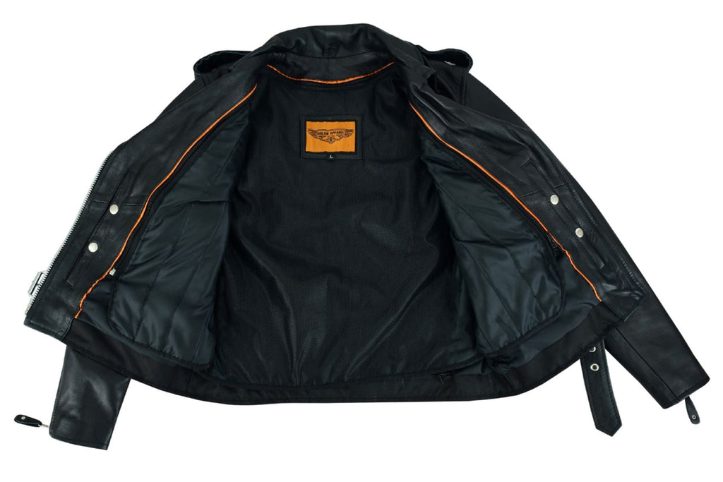 Woah. This gorgeous police style classic biker jacket in naked cowhide leather by Dream Apparel is a must have for piece for any and every biker alike. Our jacket features quilted lining, epaulets on the shoulders, a full panel on the back to add your clubs' colors, a fold-down collar with button snaps, side laces, and a sturdy, front zip-up closure. You'll feel great as you tighten up the leather belt and zippered cuffs while opening the two zippered air vents on the back. It won't matter if you're going out for the day or just around the corner, you'll never have to leave it behind with two waist pockets, two concealed gun pockets, a stash pocket, and a zippered pocket on the left front. Ride proudly in comfort and style with this amazing jacket, and don't miss out.